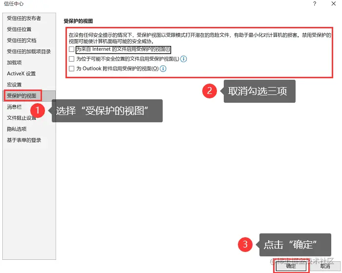 3.点击左侧【受保护的视图】,将右侧三个选项都取消勾选,并点击【确定】即可。