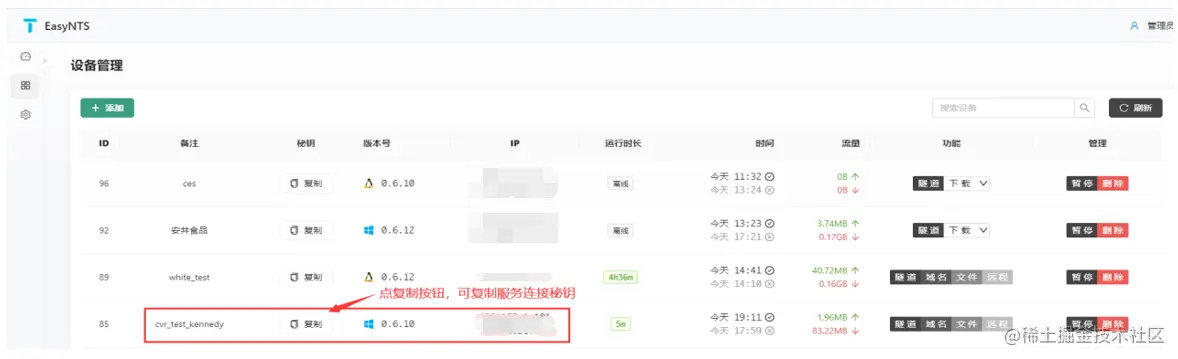 - EasyNTS:可通过EasyNTS提供的秘钥添加任务连接到EasyNTS,实现端口穿透、远程运维等操作,极大地方便项目部人员远程运维。