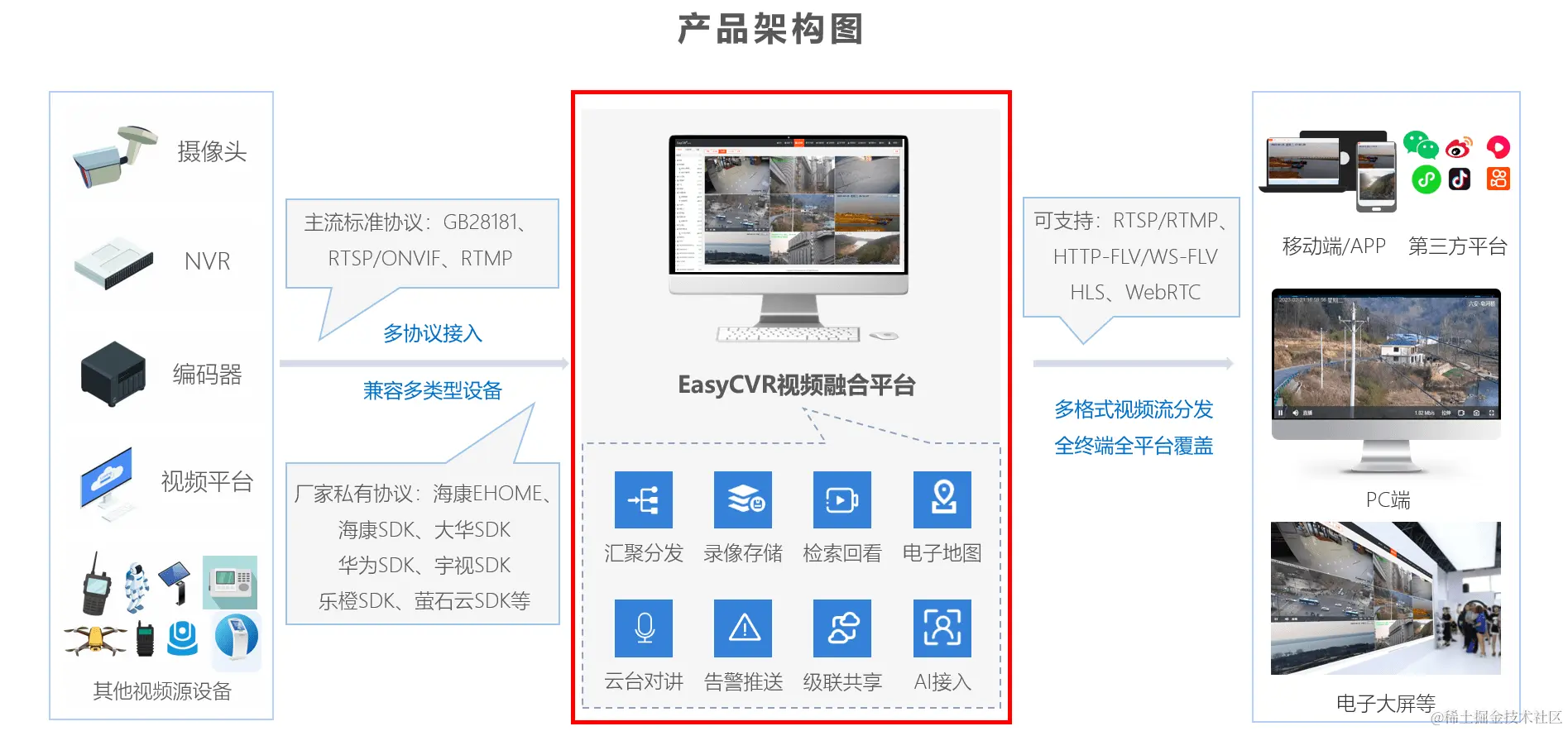 EasyCVR视频融合平台基于云边端一体化架构,具有强大的数据接入、处理及分发能力,平台支持海量视频汇聚管理,能在复杂的网络环境中,将分散的各类视频资源进行统一汇聚、整合、集中管理,实现视频资源的鉴权管理、按需调阅、全网分发、智能分析等。