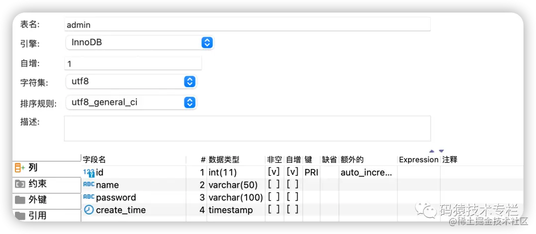 admin表字段