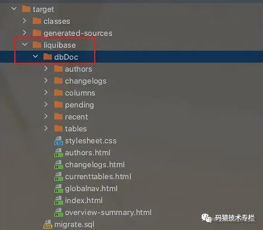 双击liquibase plugin面板中的liquibase:dbDoc选项,会生成数据库修改文档,默认会生成到target目录中,如下图所示