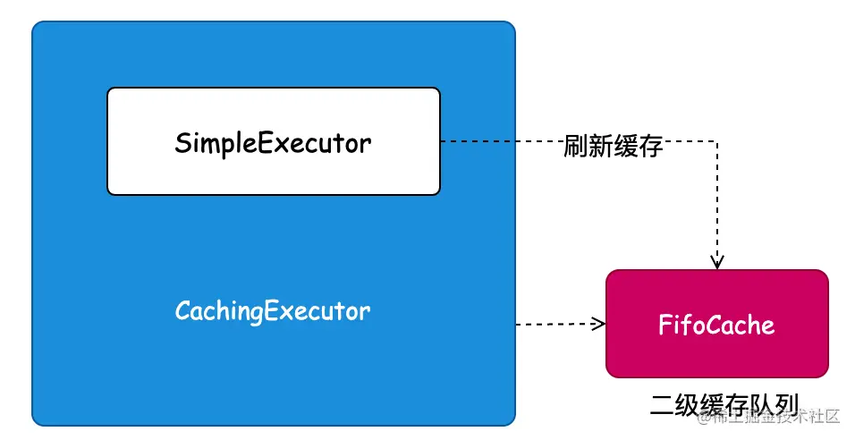 - 场景介绍:Mybatis 的所有 SQL 操作,都是经过 SqlSession 会话调用 SimpleExecutor 简单实现的执行器完成的,而一级缓存的操作也是在简单执行器中处理。那么这里二级缓存因为是基于一级缓存刷新操作的,所以在实现上,通过创建一个缓存执行器,包装简单执行器的处理逻辑,实现二级缓存操作。那么这里用到的就是装饰器模式,也叫俄罗斯套娃模式。