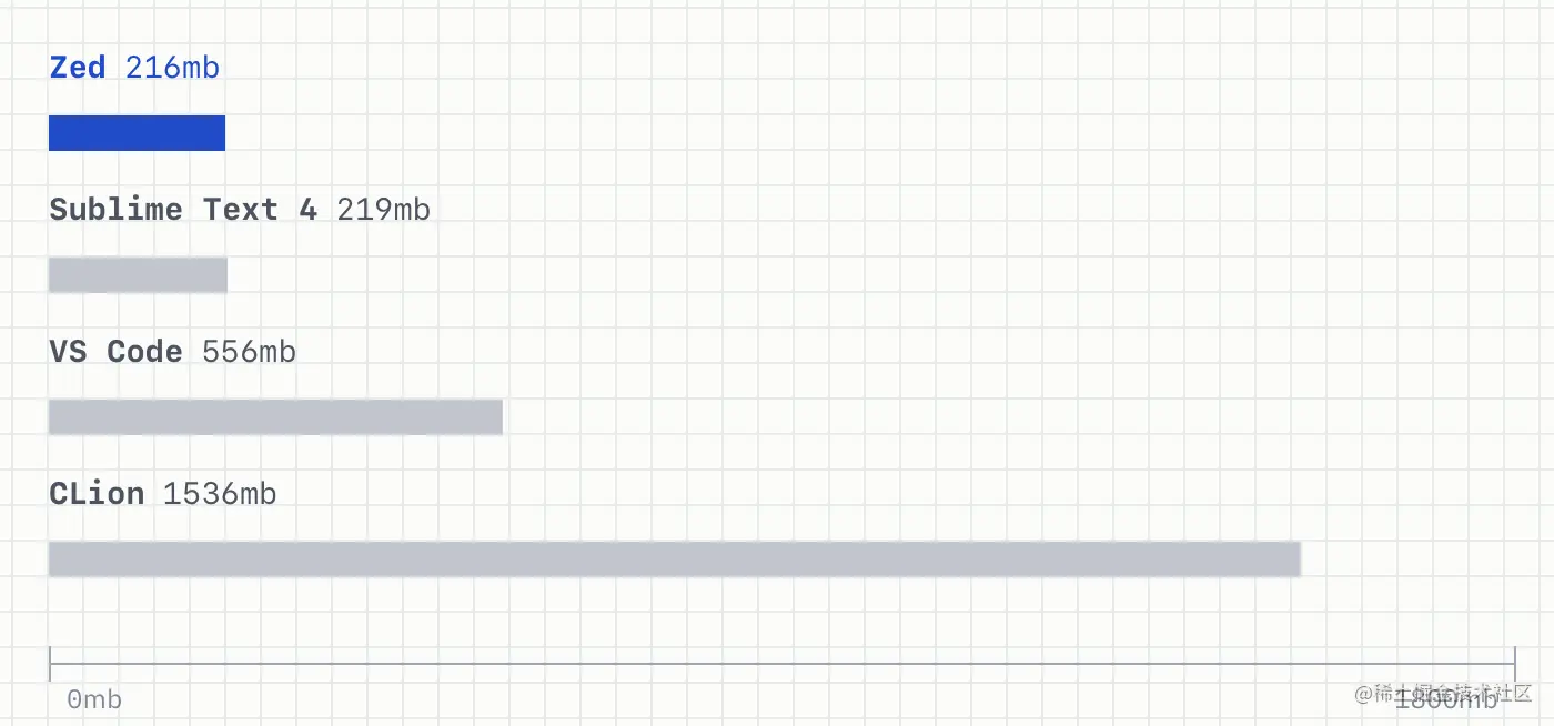 快速轻便,简单清爽,这就是Zed.dev给我们的第一印象,很明显,在桌面编辑器层面,Rust具有及其出挑的优势,它以闪电般的速度处理功能复杂的任务,同时还减少了与内存、边界、空变量、初始化变量或整数溢出相关的错误,下面是Zed.dev的内存占用情况: