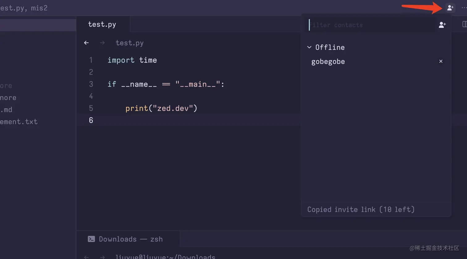 我们可以从协作菜单中添加一个现有的Zed.dev用户作为联系人,从窗口右上角的加号图标进行部署,或者通过组合键command-shift-c,然后单击搜索框右侧的添加图标按钮: