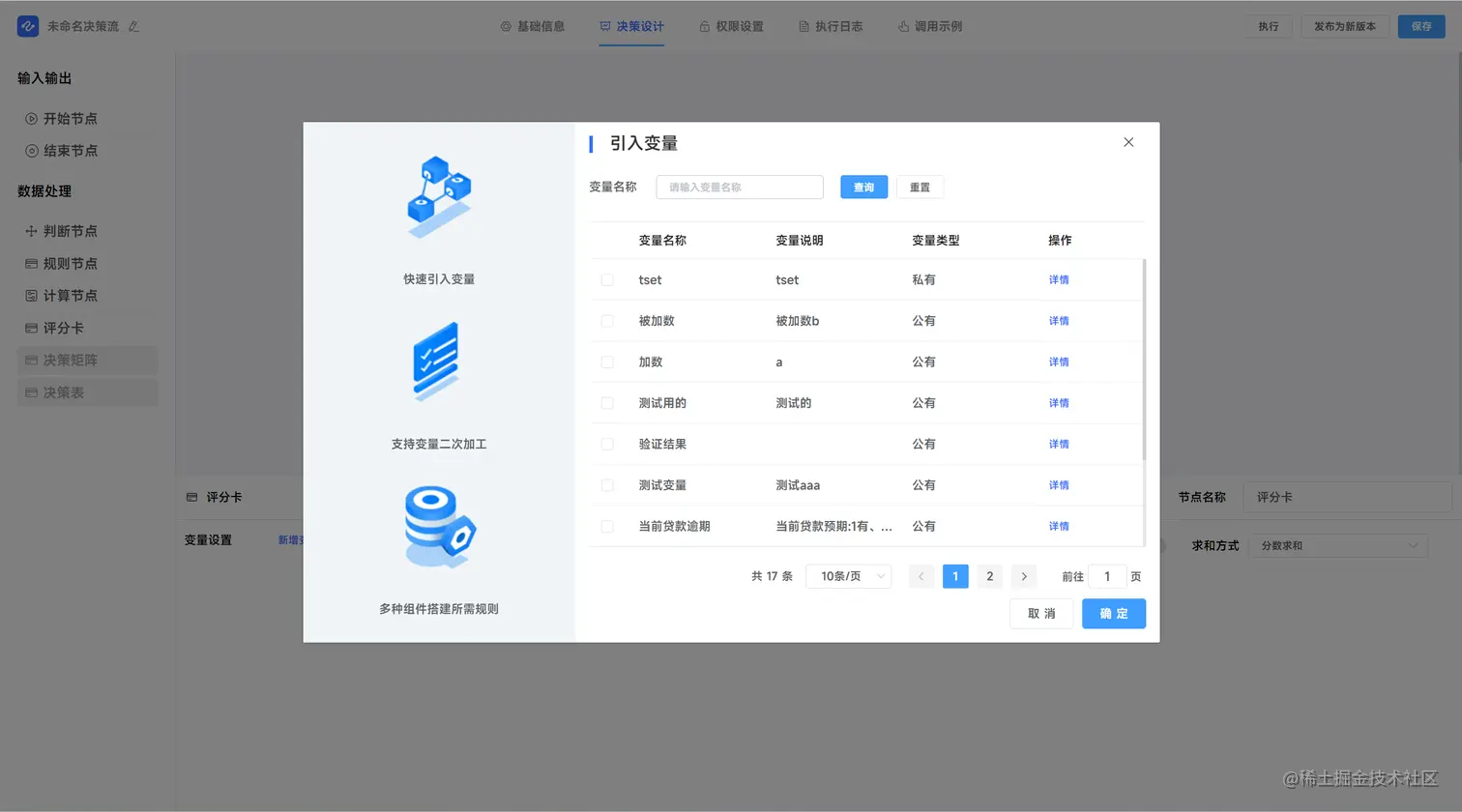 JVS规则引擎在2.1.7版本重点优化了操作体验,包括界面的UI调整、变量的功能调整。如下图所示: