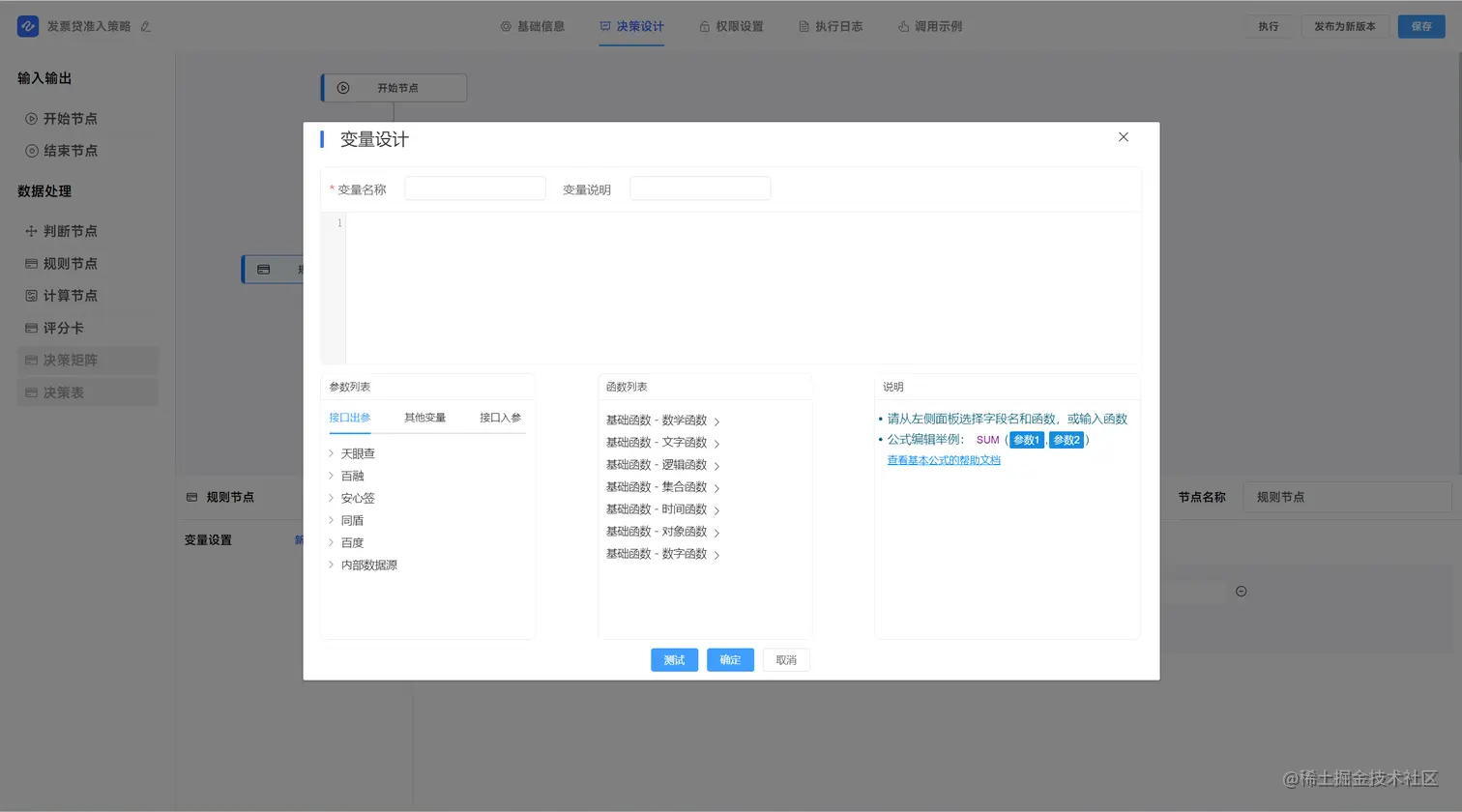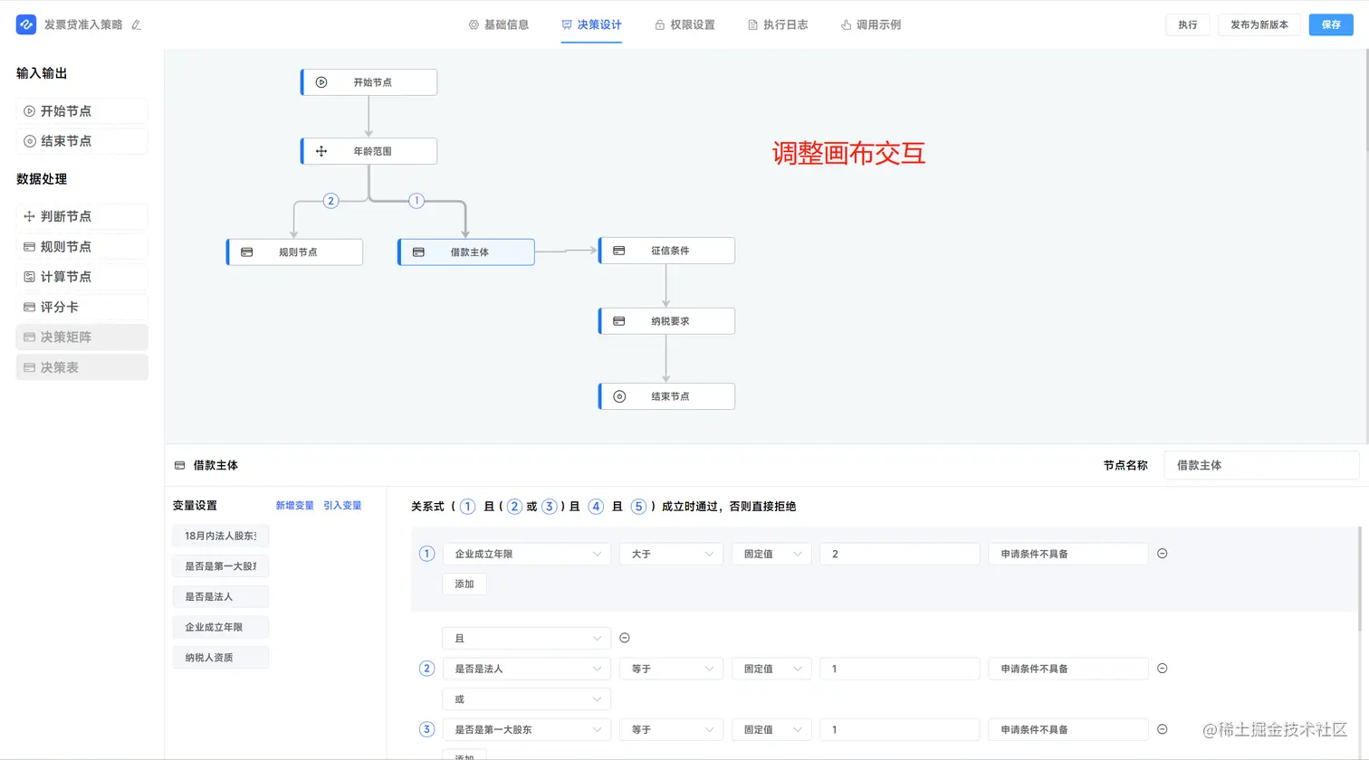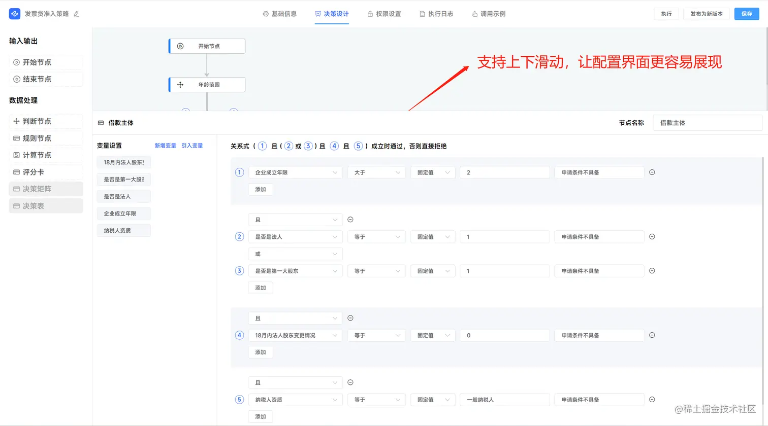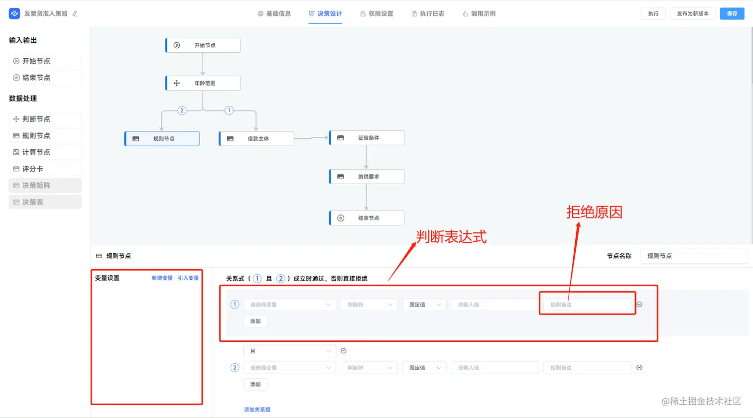 c、规则节点的界面化规则配置,通过变量形成判断因子,由判断因子组成 复杂的规则表达式,当表达式成立时通过,否则拒绝。