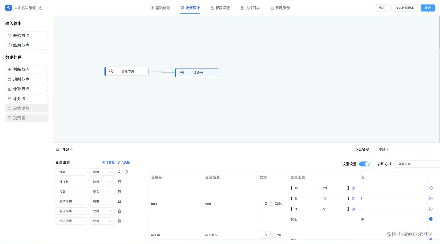 e、新增评分卡节点,支持 离散式数据、连续性数据等方式对应打分,支持权重打分,如下图