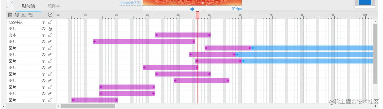 动画时间轴用于编辑动画的状态,可以拖动游标滑动到指定的时间刻度,查看该时间刻度下的动画状态。每一行代表一个图层,每条色带代表动画效果,紫色代表进入动画,蓝色代表强调动画,黄色代表离开动画。可以拖动色带设置动画的延迟时间,也可以拖动色带两端的小点设置动画执行的时长。还可以配合时间轴截图哟!
