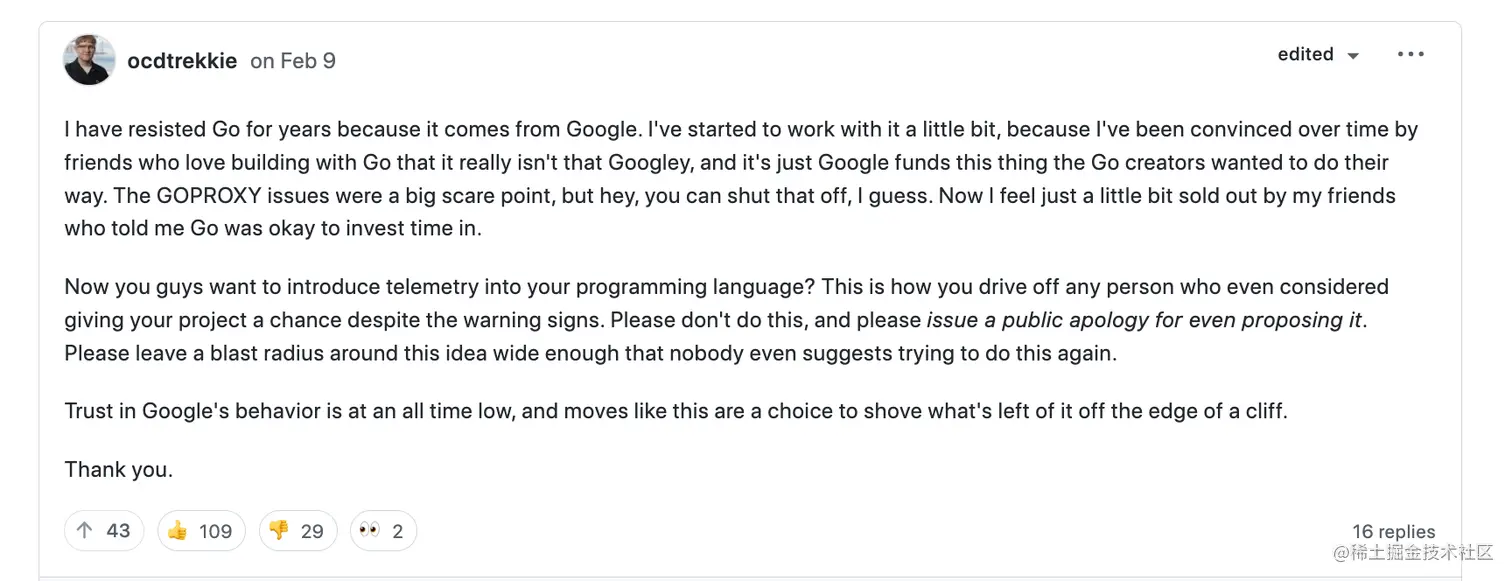 - Go 团队需要持续的教育和引导用户,选择加入遥测是一个很好的选择,对大家都有益处。