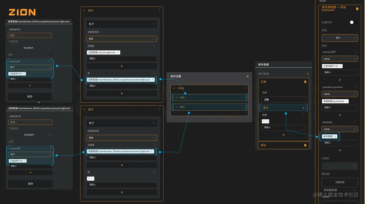 通过聚合过滤判断该题是否得分 多选题的得分规则是选中所有的正确选项才得分,所以我们需要判断用户是否选择并只选中了所有正确选项。可以拆解成为两步: ●用户所选项中包含正确选项 ●所有的用户所选项中只有正确选项 如果我们对比发现,用户所选答案对应的right分数等于同一道题选项本身对应的right分数,就可以确保用户所选项中至少包含了正确选项。 同时再让用户的所有答案对应的right都不小于1,就可以确保用户只选了正确的选项。 具体流程如下: ●在用户选择的选项批量导入到answers表中,我们可以设置修改表数据行为成功时添加finalresult,其中参数finalmark为条件数据,如果用户答对,标记finalmark为1,否则finalmark为0。 正确的条件如下 ●正确的条件如下