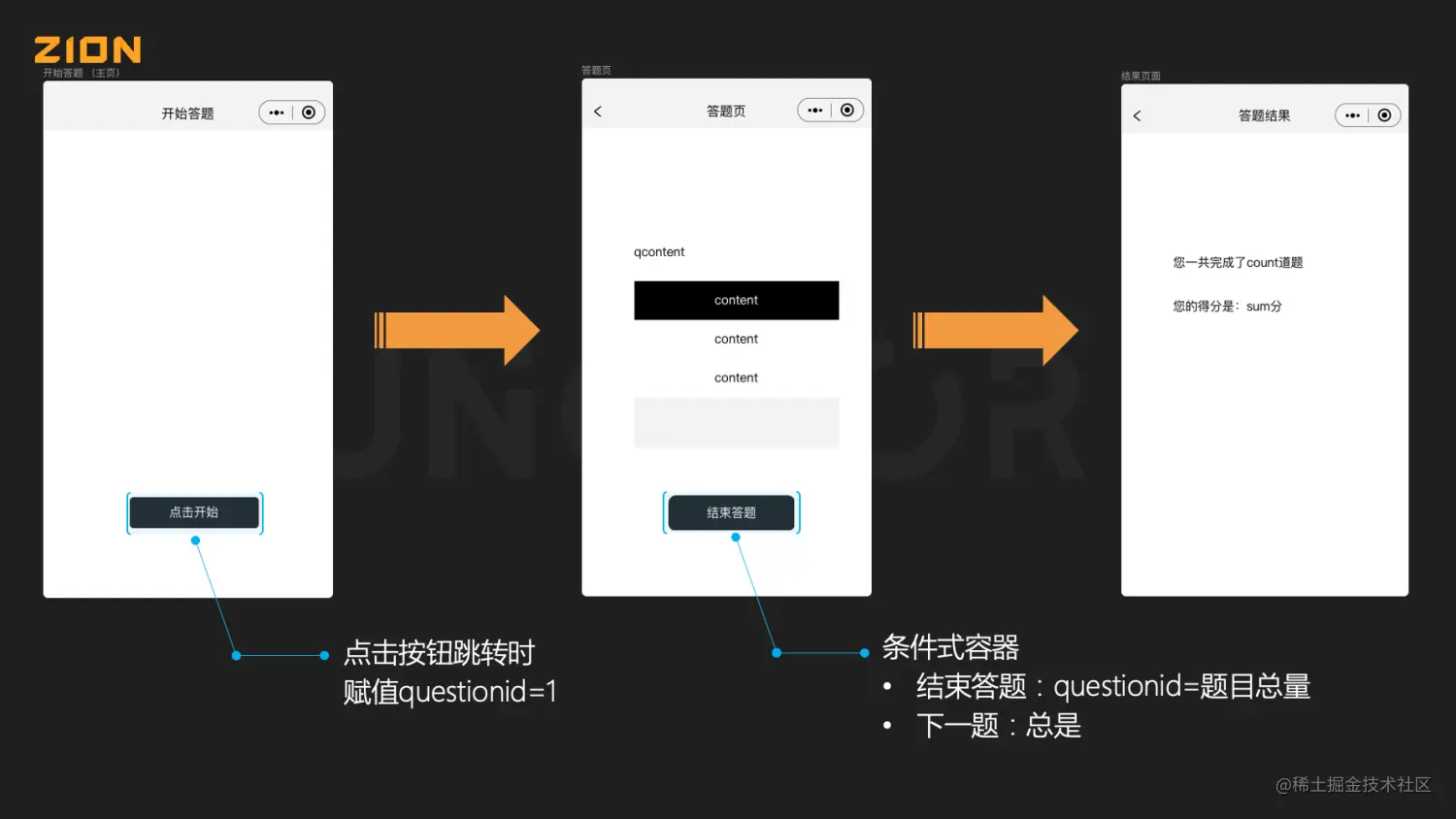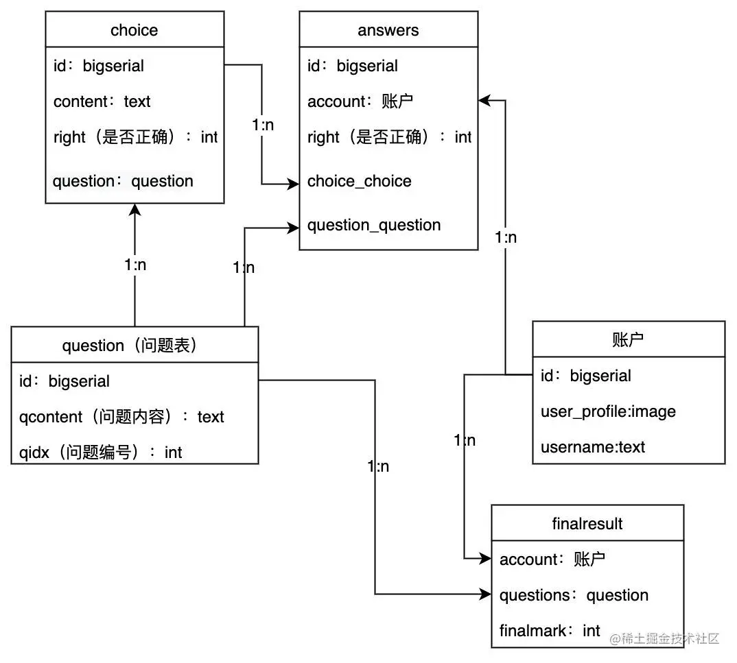 ●点击开始按钮可以跳转进入答题页面,在用户答完所有题后点击结束答题按钮进入答题结果页面 (页面跳转设置可参考最佳实践|单选问卷 ) ●用户答完本题点击进入下一题或者结束答题时,就需要判断用户是否回答正确,并且将这题的得分记录到finalresult表中 数据模型
