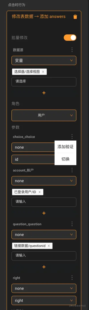 ●一个问题对应多个选项,所以问题表question与选项表choice是一对多关系 问题表中的qidx表示问题编号 选项表中的right用来表示该选项是否是正确选项之一,值为1或0 ●answers表记录了用户选择的每个选项及这些选项是否正确 ●finalresult表记录了用户回答过的问题和该题的最终得分 批量修改表数据 用户完成多选后,会点击下一题按钮或者结束答题按钮,我们需要在按钮行为中,完成用户是否答对,并将得分与否记录到finalresult中。 首先我们需要将用户选择的选项批量导入到answers表中,再判断这些选项是否就是正确选项。 具体流程如下: ●打开批量修改,数据源选择选择视图 ●参数choice需要点击切换,再选择id字段 ●参数right同样需要切换,再选择right字段