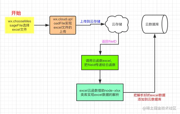 效果其实很简单,就是把excel里的数据解析出来,然后存到云数据库里。说起来很简单。但是真的做起来的时候,发现其中要用到的东西还是很多的。不信。。。。 那来看下流程图