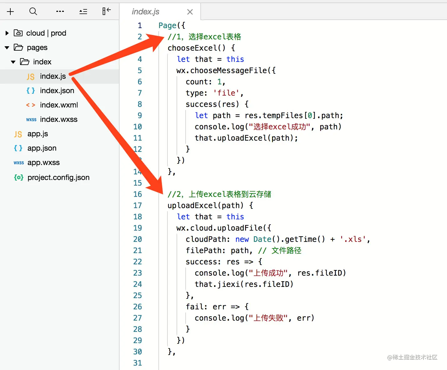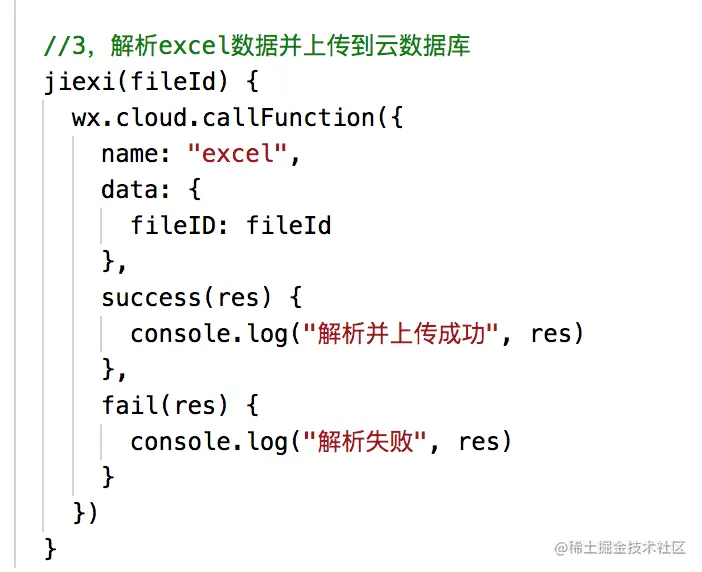 uploadExcel就是我们的文件上传方法,上传成功以后会返回一个fildID。我们把fildID传递给我们的jiexi方法,jiexi方法如下 - 3 把fildID传递给云函数
