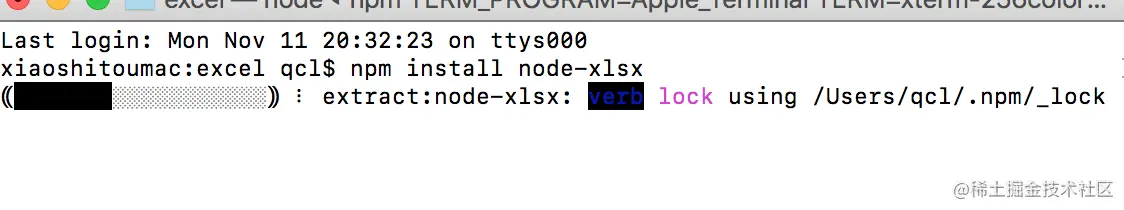 输入 npm install node-xlsx 安装依赖。可以看到下图安装中的进度条