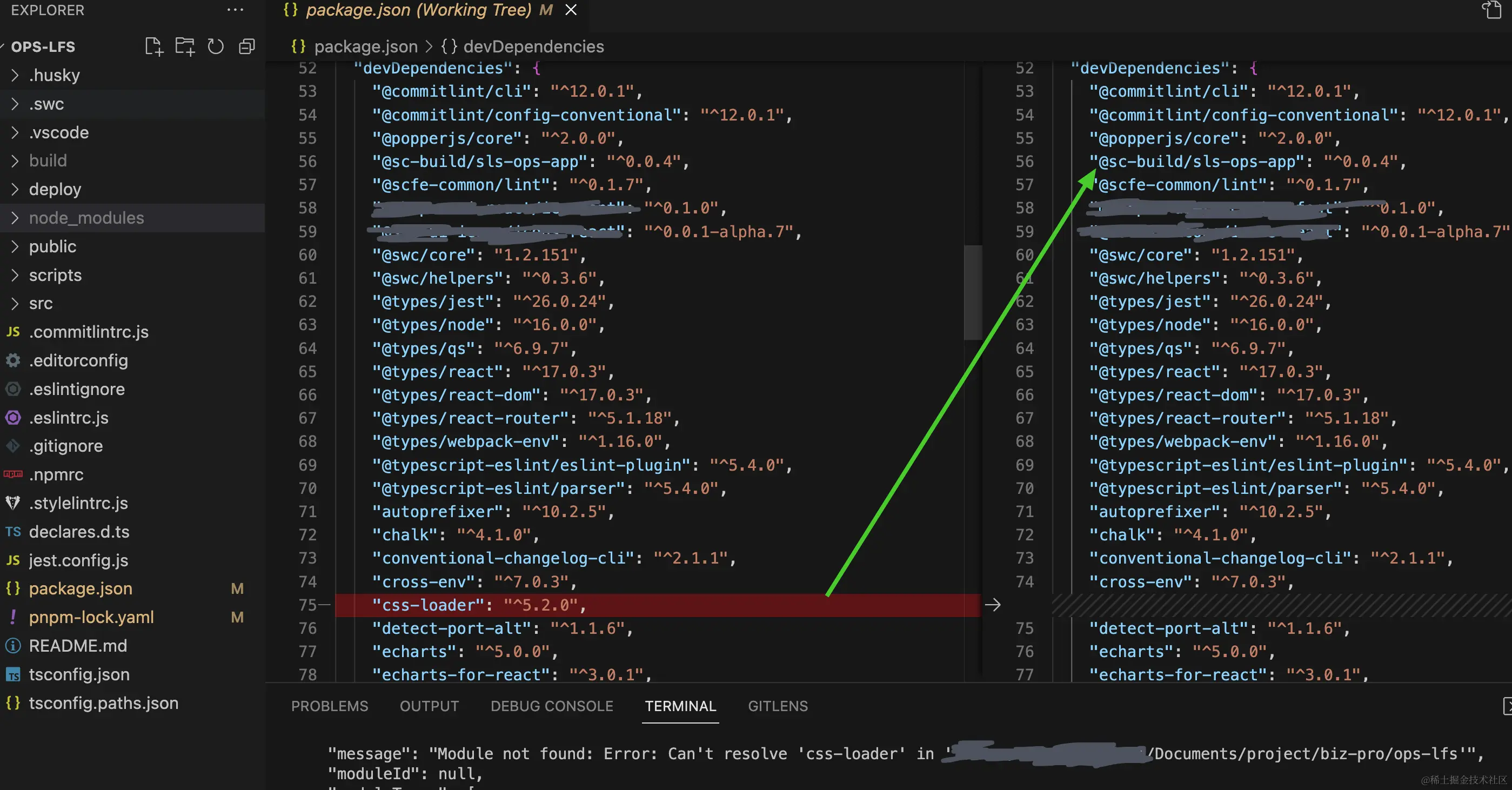 通过上述描述,我们已经基本确定了 Can't resolve 'css-loader' 的报错问题和 css-loader 这个包在项目中的依赖层级由“直接依赖”变成了“二级依赖”有关。