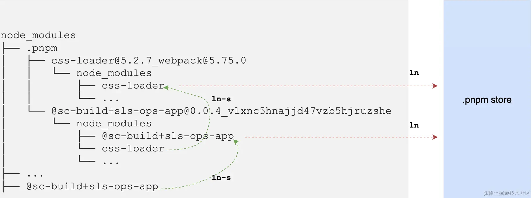- 其次,当前的依赖包是从全局 store 硬连接到当前项目虚拟 store 的,这里的虚拟 store 就是