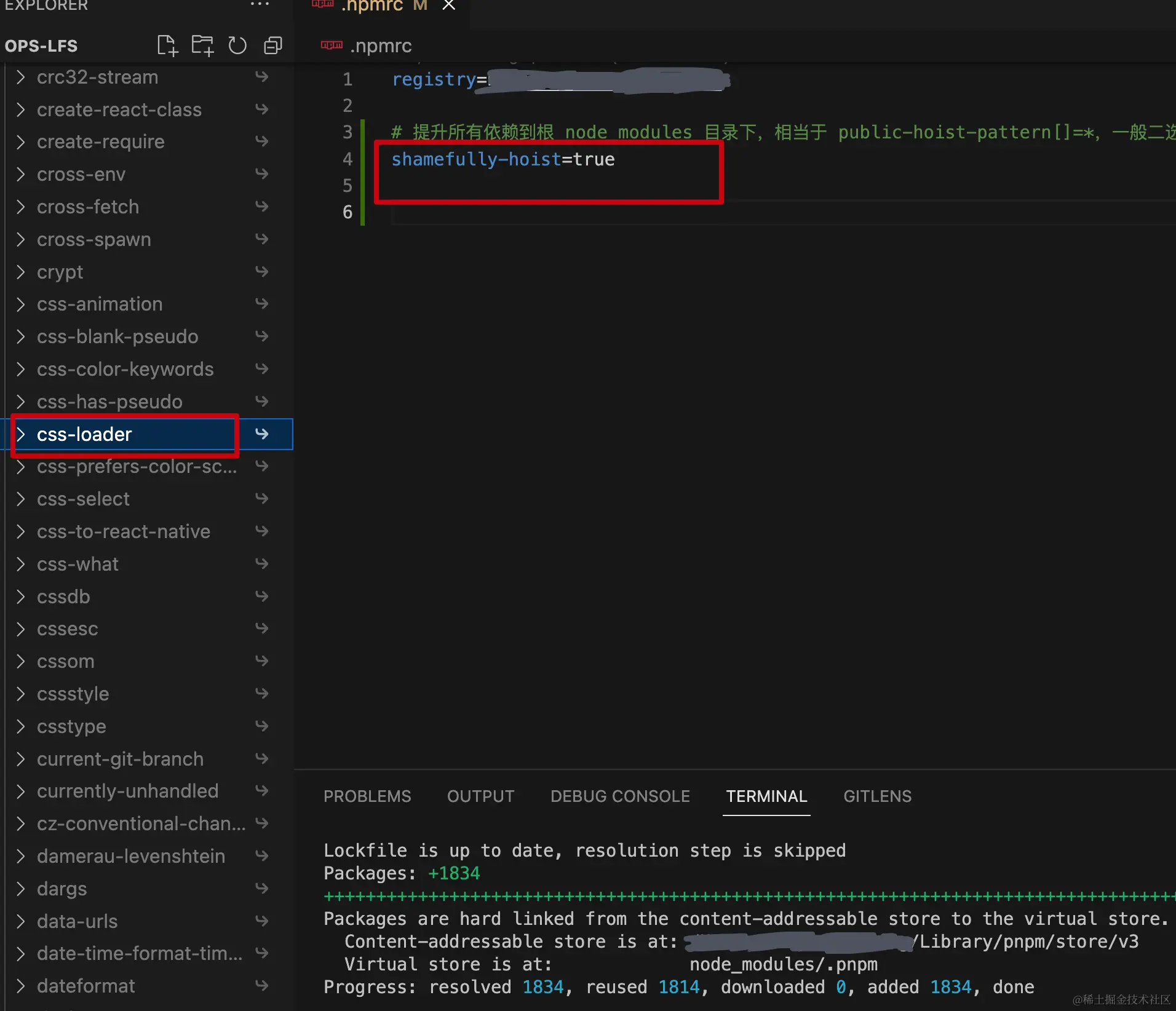 最后,配置 shamefully-hoist=true 为什么看似能“解决问题”,是因为开启这个配置项会导致 pnpm 部分降级成 npm,即会依赖提升,此时会再次让 css-loader 安装到 node_modules 根目录下。