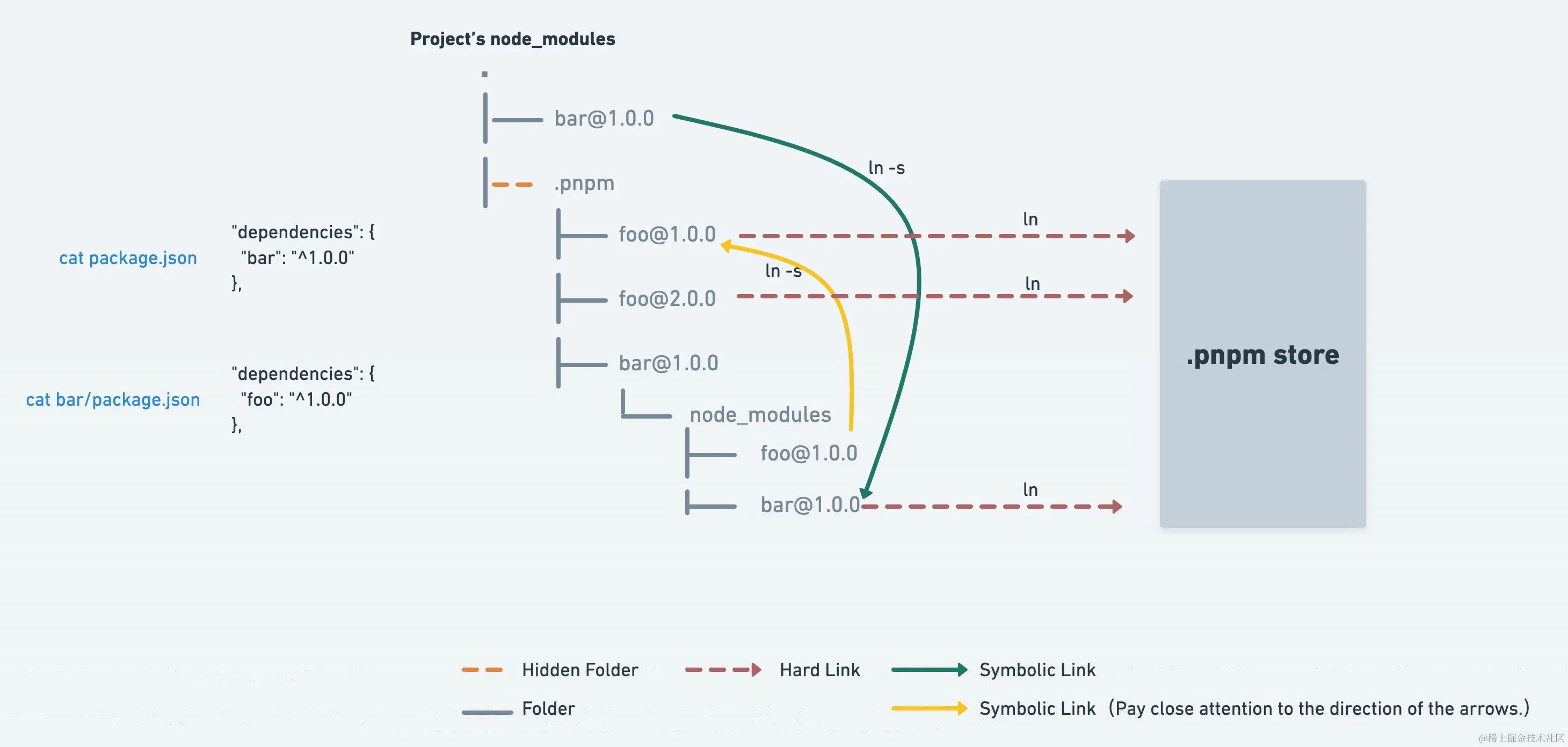 - 首先,pnpm 在全局的 store 中存储硬链接(Hard link),不同的项目可以从全局 store 寻找到同一个依赖,大大地节省了磁盘空间。