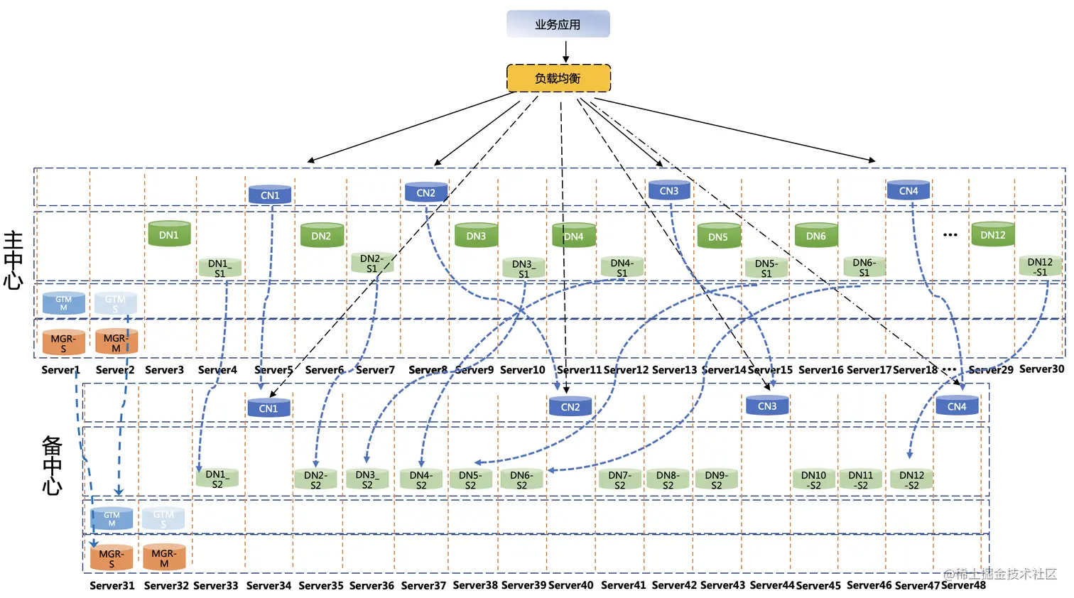 华南中心项目中,AntDB采用了典型的分布式架构,具备双中心容灾机制,主备中心共有48台主机,数据节点DN1-DN12配置为一主两备,其中主中心一主一备,容灾中心为异步备节点,共计36节点。GTM主备中心各两台,分别为一主一备,共计4节点。计算节点主备中心各4台,共计8节点,主备节点之间采用流复制方式同步数据。DN1到DN12为主数据节点,其余数据节点均为备节点。备数据中心的节点通过级联复制的形式同步数据。通过ADBMGR的高可用命令完成切换操作。其架构如下图3所示。