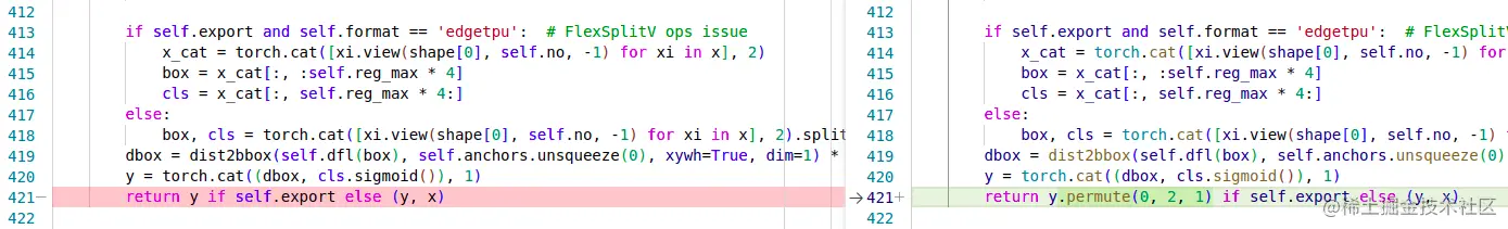 这样的通道排列顺序有个问题,那就是后处理的时候会造成内存访问不连续。为了解决这个问题,我们可以修改一下代码,具体做法是把ultralytics/nn/modules.py文件中的421行做如下修改,交换一下张量y的通道顺序: