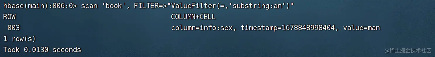 scan '表名称', FILTER=>"ValueFilter(=,'substring:某子串')"