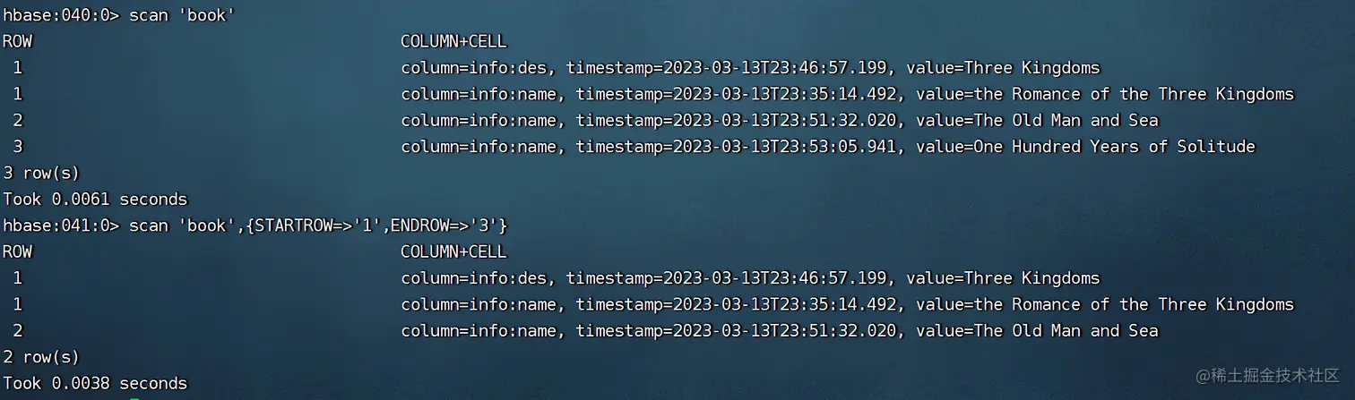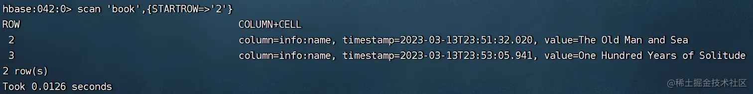 scan 'book',{STARTROW=>'1',ENDROW=>'3'}