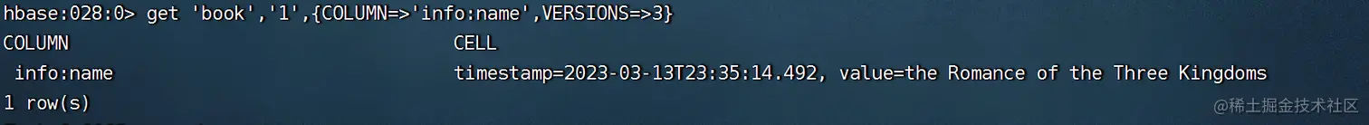 get 'book','1',{COLUMN=>'info:name',VERSIONS=>3}