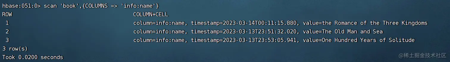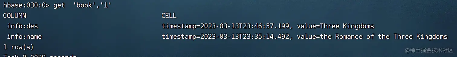 示例:向 ‘book’ 表中 info列族 name列 插入一条数据 ‘the Romance of the Three Kingdoms’