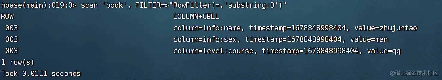 scan 'book', FILTER=>"RowFilter(=,'binary:003')"