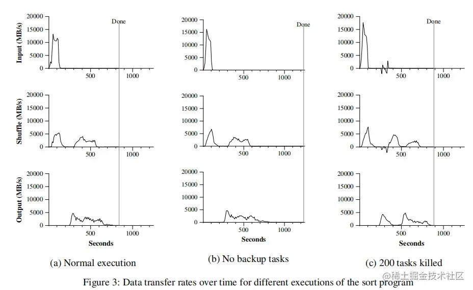 图三(a)显示了这个排序程序的正常执行过程。左上的图显示了输入数据读取的速度。数据读取速度峰值会达到13GB/s,并且所有Map任务完成之后,即大约200秒之后迅速滑落到0。值得注意的是,排序程序输入数据读取速度小于分布式grep程序。这是因为排序程序的Map任务花了大约一半的处理时间和I/O带宽把中间输出结果写到本地硬盘。相应的分布式grep程序的中间结果输出几乎可以忽略不计。