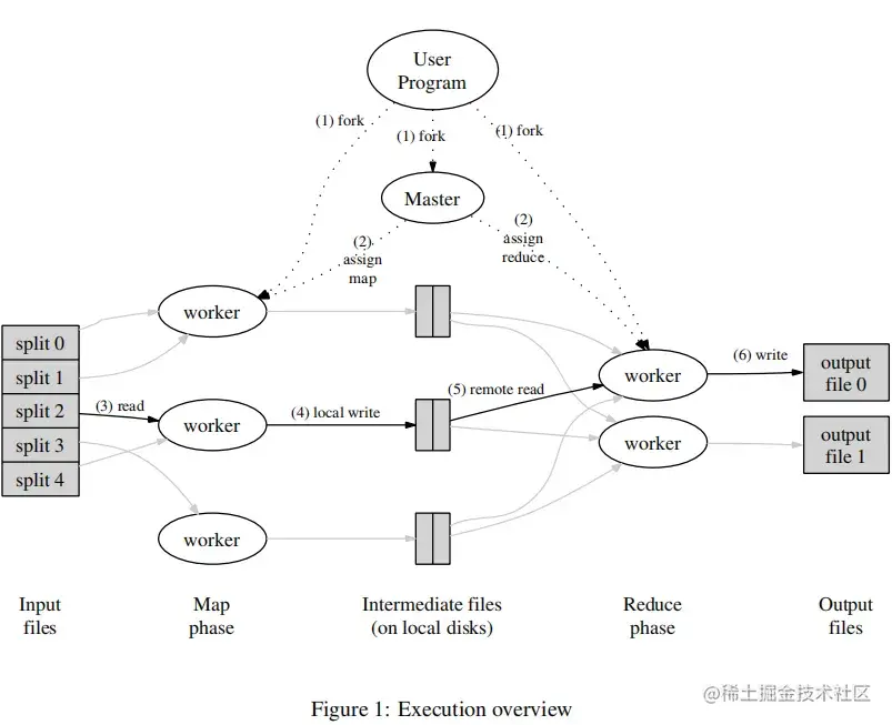 图1展示了我们的MapReduce实现中操作的全部流程。当用户调用MapReduce函数时,将发生下面的一系列动作(下面的序号和图1中的序号一一对应):