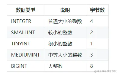 整数型数据类型包括INTEGER、SMALLINT、TINYINT、MEDIUMINT和BIGINT五种长度不同的类型。