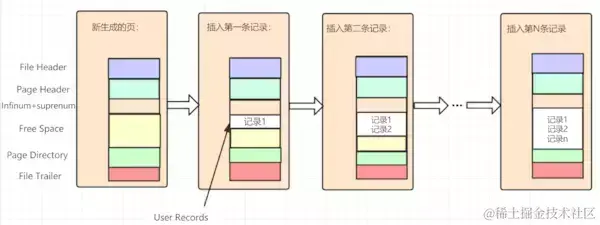 每当我们插入一条记录,都会从Free Space部分,也就是尚未使用的存储空间中申请一个记录大小的空间划分到User Records部分,当Free Space部分的空间全部被User Records部分替代掉之后,也就意味着这个页使用完了,如果还有新的记录插入的话,就需要去申请新的页了,这个过程的图示如下: