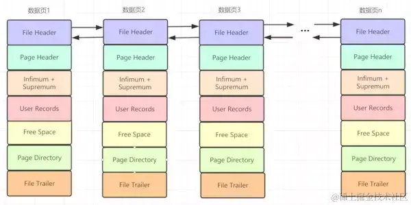 一张表中可以有成千上万条记录,一个页只有16KB,所以可能需要好多页来存放数据。不同页其实构成了一条双向链表,File Header是InnoDB页的第一部分,它的FIL_PAGE_PREV和FIL_PAGE_NEXT就分别代表本页的上一个和下一个页的页号,即链表的上一个以及下一个节点指针。