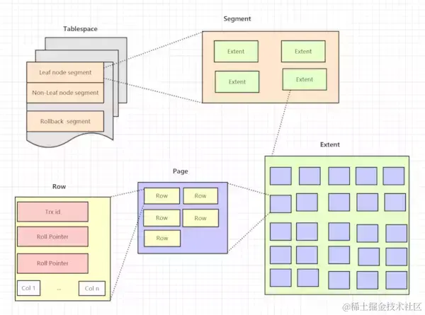 - 表空间由段组成,常见的段有数据段、索引段、回滚段等。