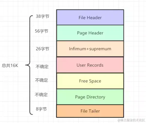 其中File Header、Page Header、File Trailer的大小是固定的,分别为38,56,8字节,这些空间用来标记该页的一些信息,如Checksum,数据页所在B+树索引的层数等。User Records、Free Space、Page Directory这些部分为实际的行记录存储空间,因此大小是动态的。