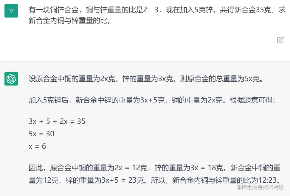 试验时,我出了一道小学数学应用题,交给ChatGPT处理,可以看到,其不仅能够理解语言,更难得的是其能学习到应用数学的逻辑关系,并通过推理解决一定的问题。