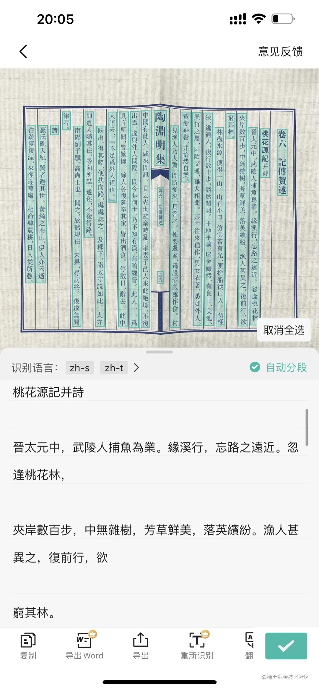 图像和文本是我们最常接触的两种模态,随着OCR技术应用的不断深入,面向图像文档中复杂结构(如汉字结构,表格结构,文档总体结构等)的建模问题也已经逐渐成为研究热点之一,如下图,用扫描全能王的“拍图识字”功能一键扫描识别竖排繁体古籍《桃花源记》,面对破损、皱褶的古籍,该功能通过分析图像图像文档复杂结构,进一步将古籍内容提取出来,赋予更加清晰、平整的古籍阅读体验。