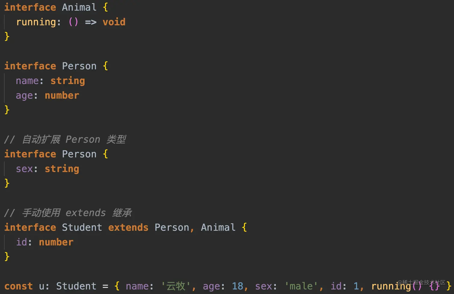 - interface 使用 extends 来实现继承,type 使用 & 来实现交叉类型