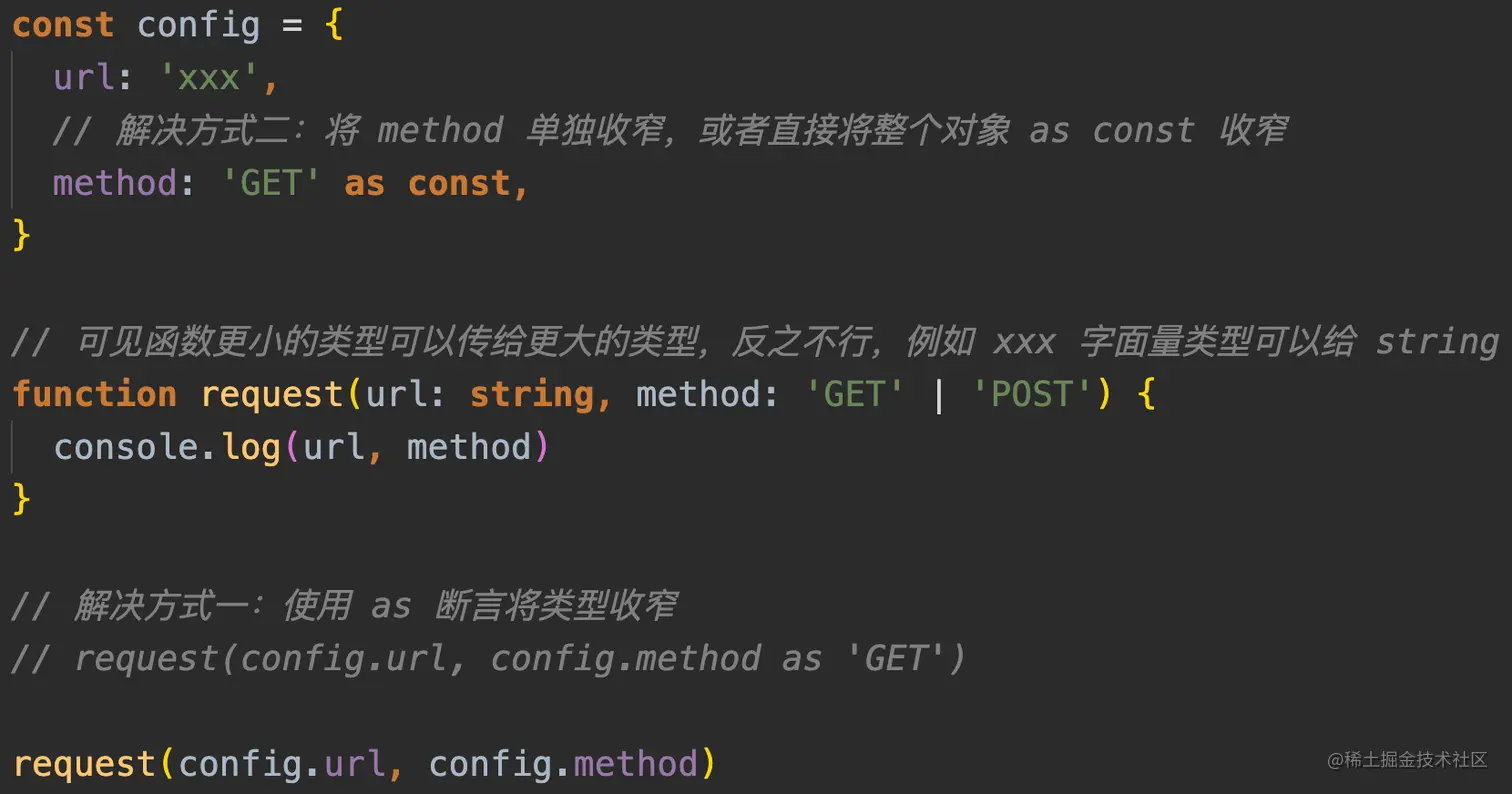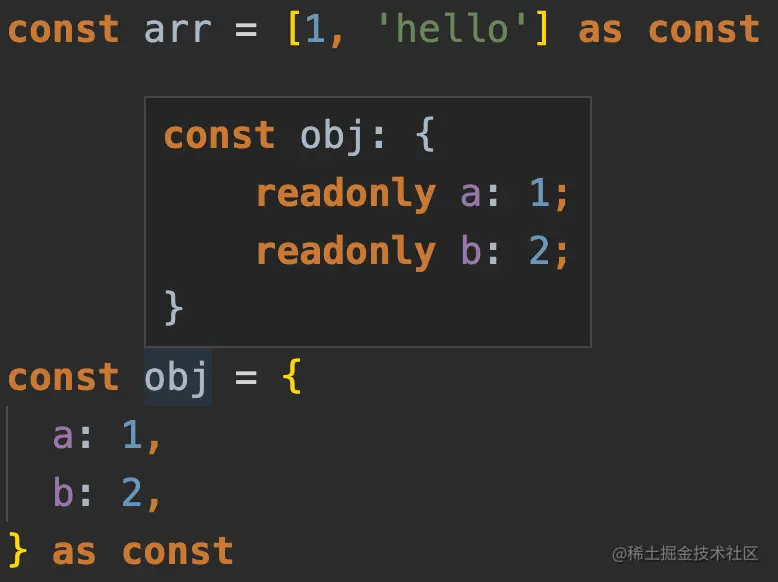 as const,将类型尽量收窄到字面量类型,如果用在对象后面,相当于给对象里面每个成员加上readonly并收窄