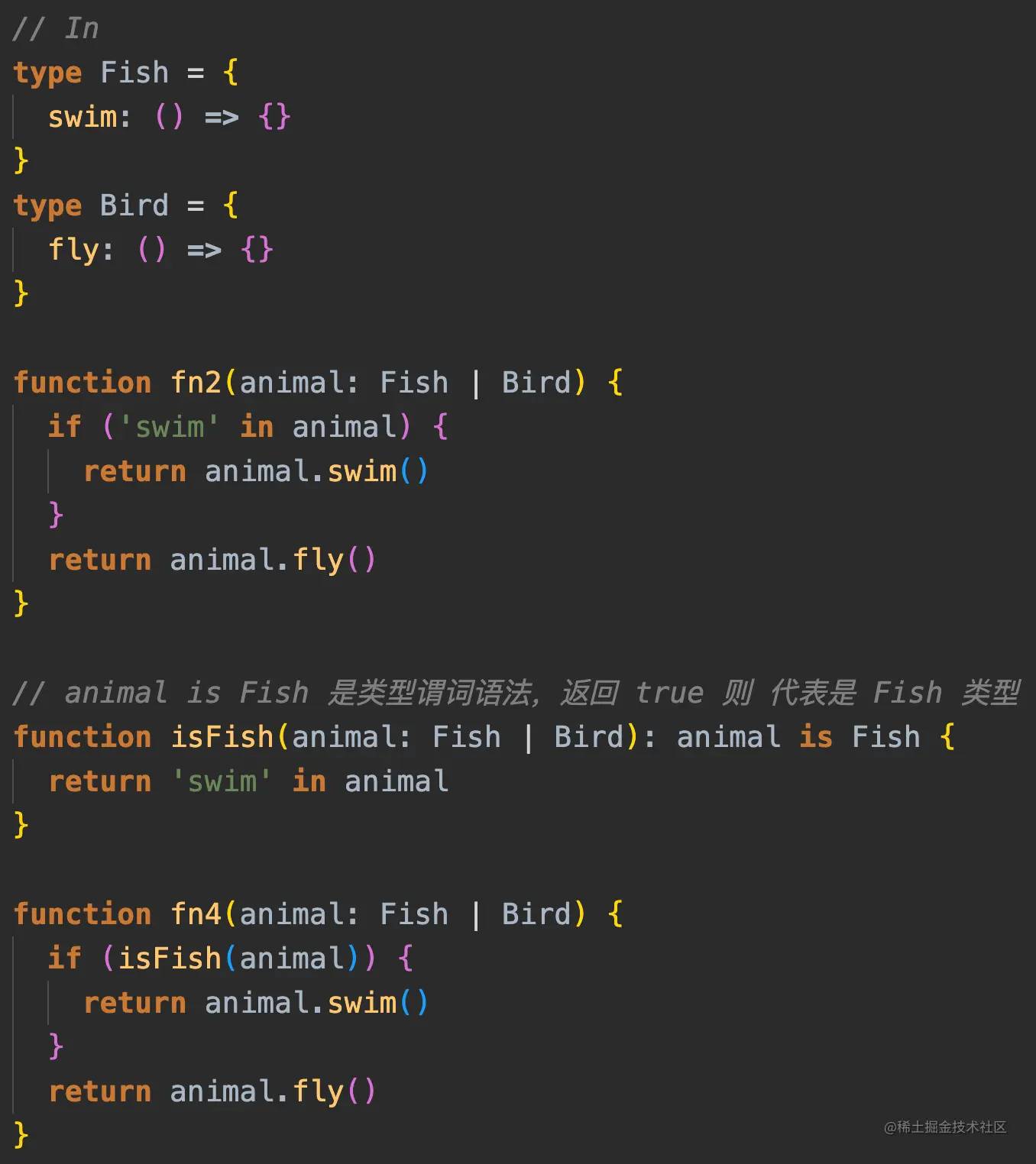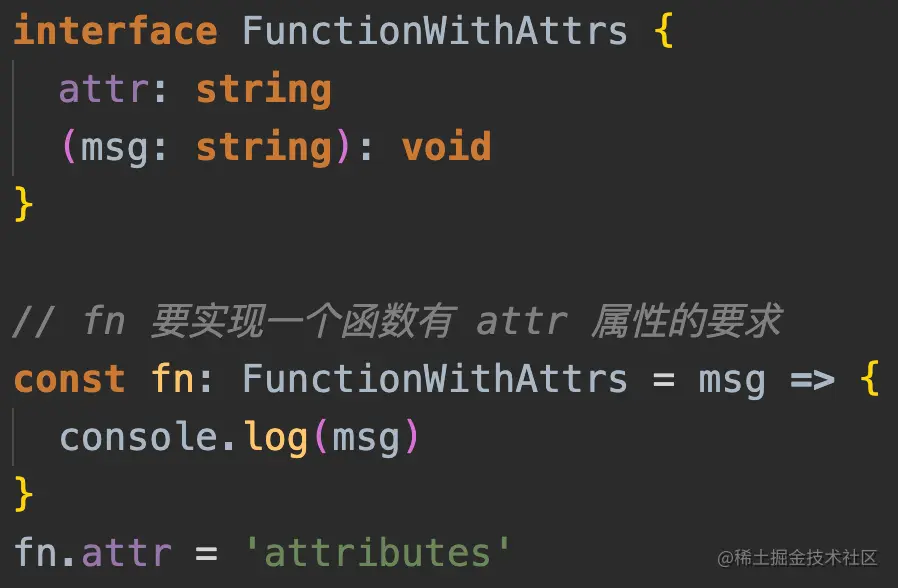 - 交叉类型则是满足多个类型的条件,使用 & 符号