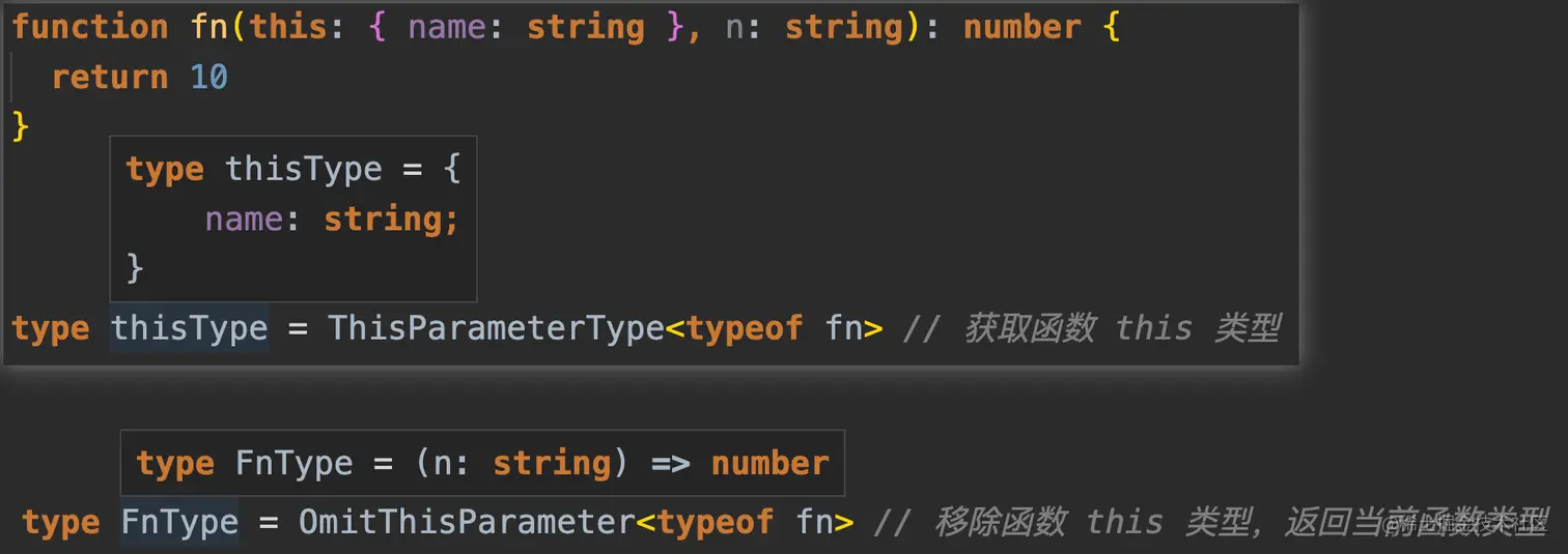ThisParameterType提取函数类型的 this 参数类型,如果没有 this 参数则返回 unknownOmitThisParameter移除函数类型 this 参数类型,返回当前函数类型