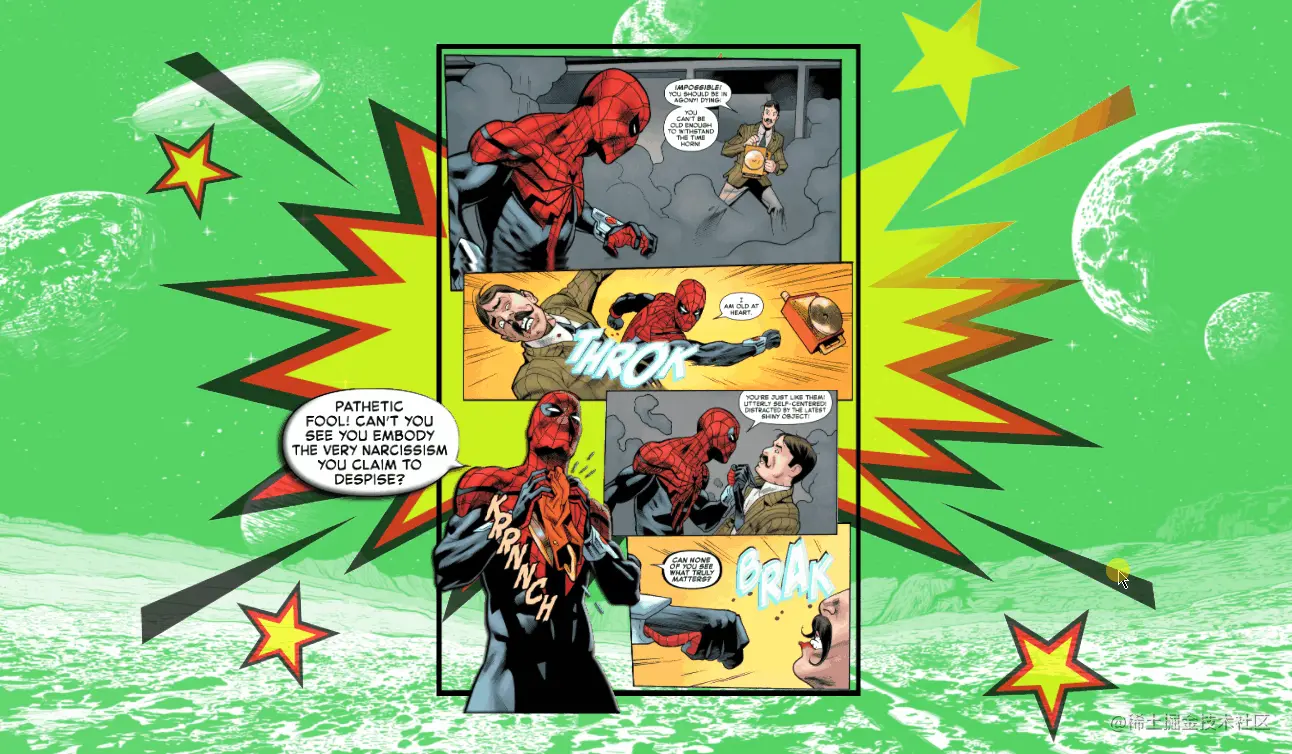 实现效果如 👇 下图所示:页面主要有背景图、漫画图片主体以及 💥 Boom 爆炸背景图片构成,按住鼠标左键移动模型可以获得不同视图,让图片在视觉上有 3D 景深效果。