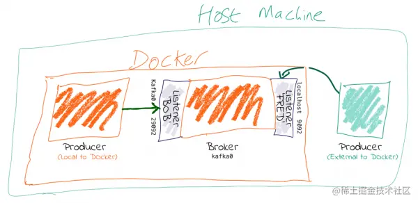 - Docker网络外部(但都在同一个Host Machine里)的客户端使用监听器FRED连接,端口为9092,主机名为localhost。9092端口是由Docker容器暴露的,因此可以连接到。当客户端连接时,他们被赋予Broker元数据的主机名localhost,因此在读/写数据时连接到此。