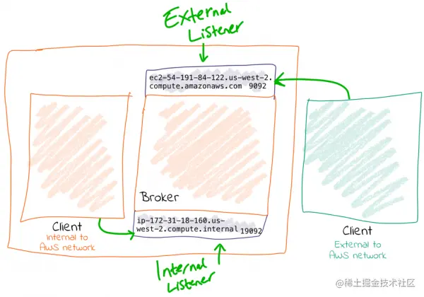 Kafka客户端很可能不在Broker的网络中,这就是额外监听器的作用。