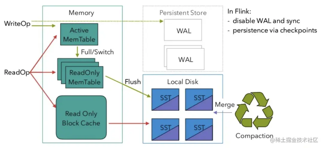 Flink RocksDB状态后端采用的是名为FRocksDB的分支版本,由Ververica维护。它的读写流程与原版基本相同,如上图所示,MemTable和BlockCache分别就是读写缓存和读缓存。特别地,由于Flink在每个Checkpoint周期都会将RocksDB的数据快照持久化到文件系统,所以不需要写预写日志(WAL)。