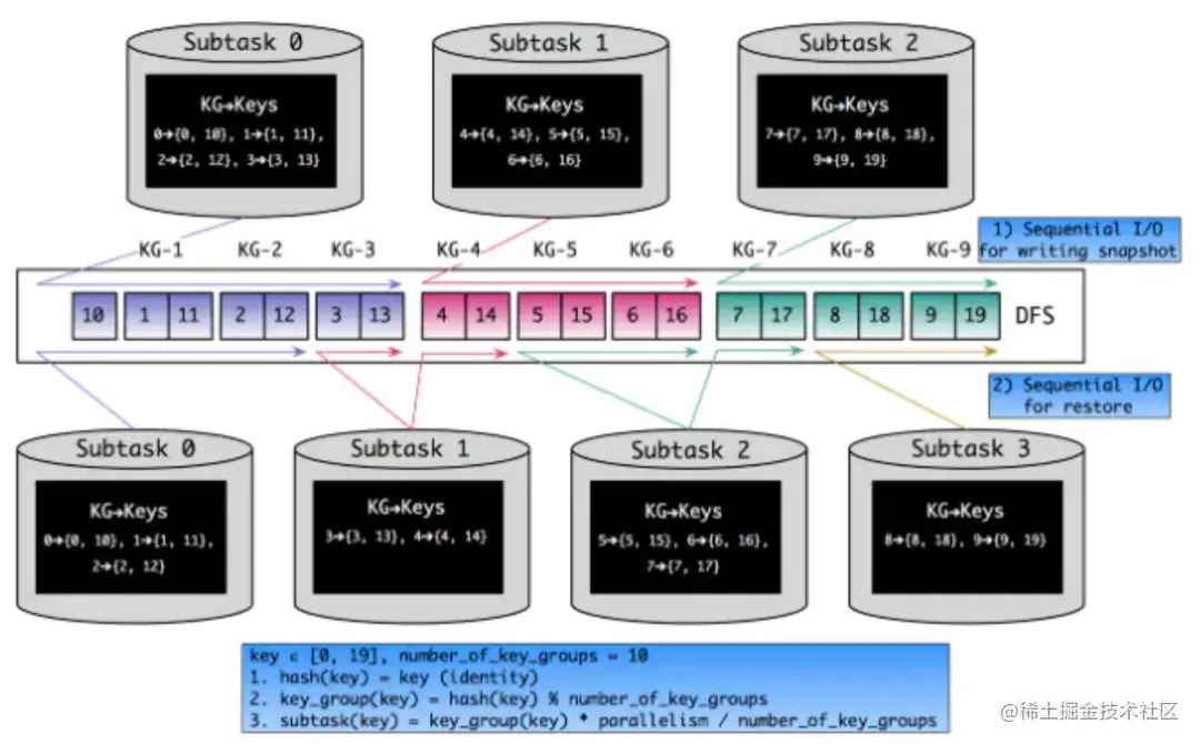 当作业的并行度改变并从CP / SP恢复时,就会涉及状态缩放的问题。Flink内Keyed State数据以KeyGroup为单位组织,每个key经过两重Murmur Hash计算出它应该落在哪个KeyGroup中,同时每个Sub-task会分配到一个或多个KeyGroup。如下图所示,并行度变化只会影响KeyGroup的分配,可以将状态恢复的过程近似化为顺序读,提高效率。