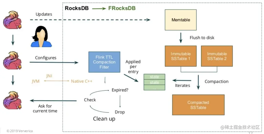 用户调用State Ttl Config# cleanupIn Rocksdb Compact Filter (N)方法,就可以设定在访问状态N次后,更新CompactionFilter记录的时间戳。当SST执行Compaction操作时,会根据该时间戳检查状态键值对是否过期并删除掉。注意若访问状态非常频繁,N值应适当调大(默认仅为1000),防止影响Compaction性能。