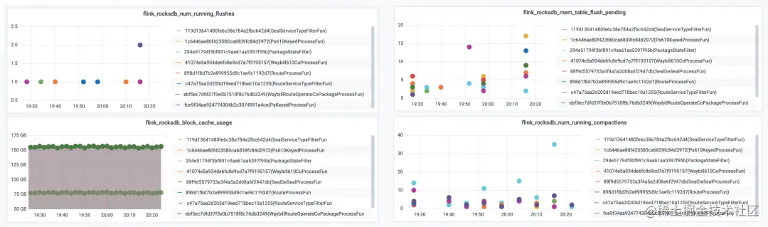上图是示例作业的部分RocksDB Metrics图表,比较正常。如果在稳定消费阶段,Flush和Compaction等重量级操作特别频繁,以至于图中的点连成线,一般就提示RocksDB遇到了瓶颈。但是托管内存(即BlockCache)占用100%是正常现象,基本不必担心。